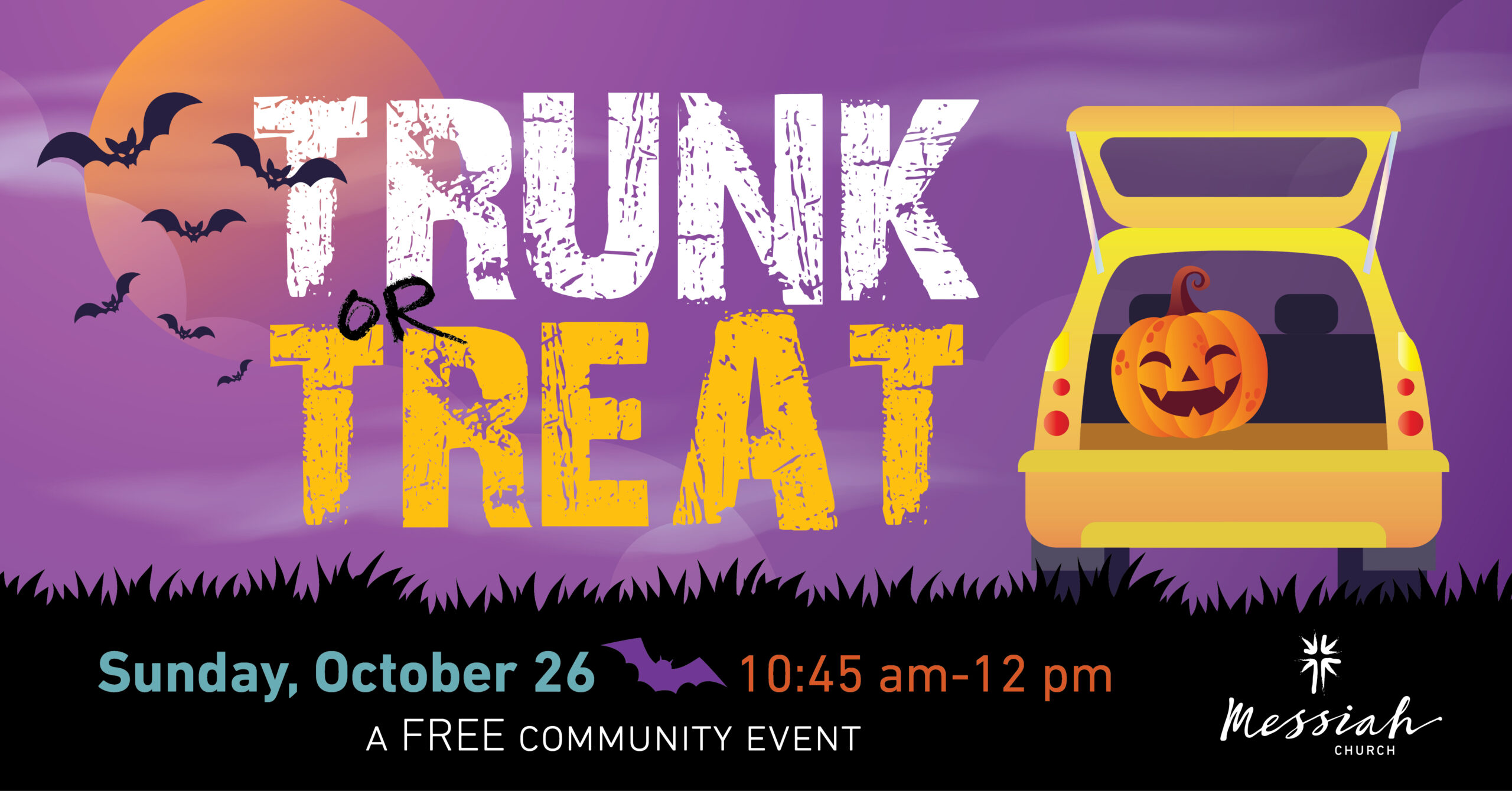 Come dressed for fun and ready for treats! Trunk or Treat is the place to be on Sunday, October 26 from 10:45 am-12 pm. Kids of all ages — join us in the Messiah Church parking lot (17805 County Road 6, Plymouth) for trick-or-treating, Halloween fun & games, and donuts & cider. Costumes are encouraged. (If it rains, we’ll move the fun indoors.) Everyone is welcome to this FREE, fun-filled fall event for the whole community!